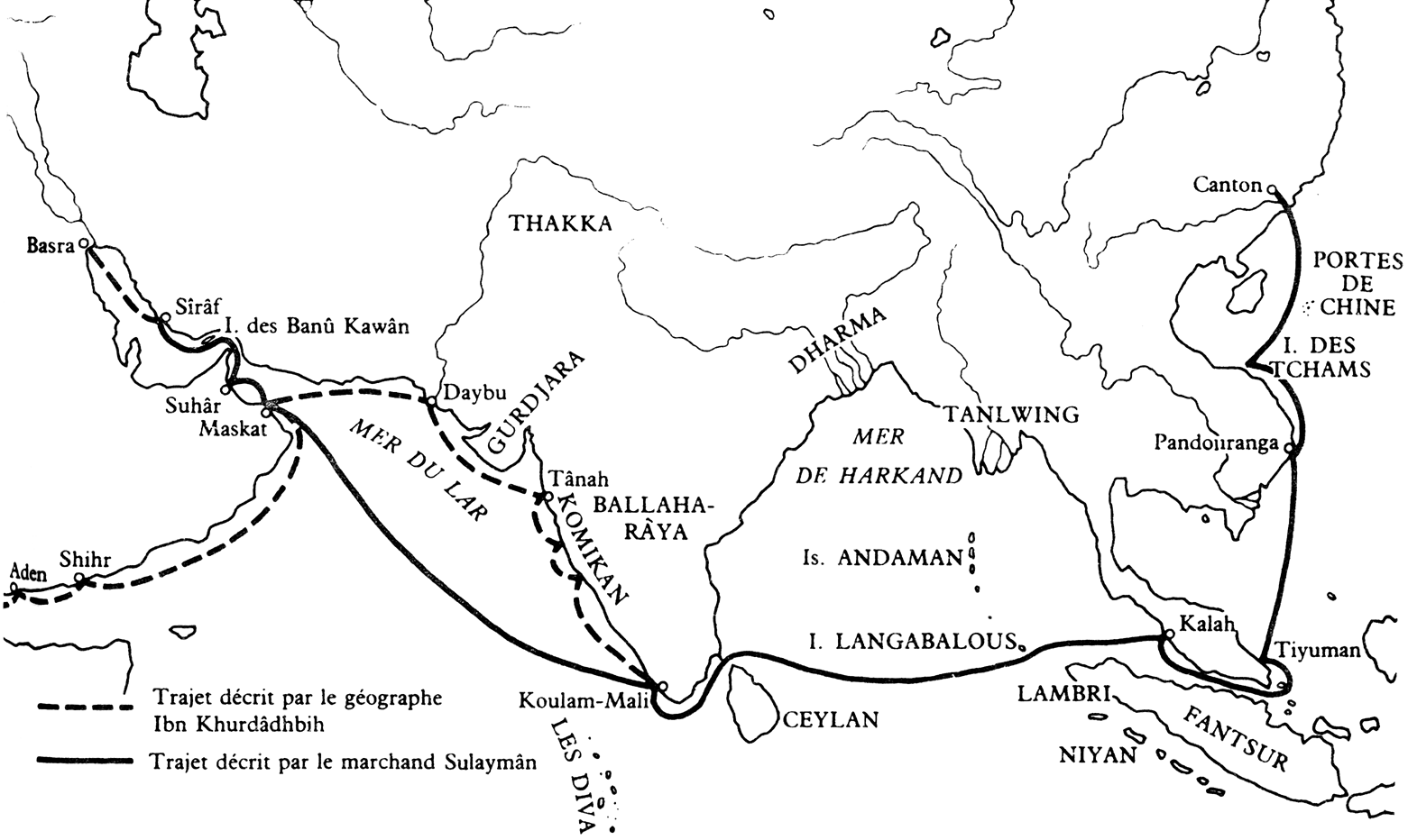 La fondation des capitales irakiennes abbassides, métropoles actives et villes royales où vivaient non seulement le calife et les membres de sa famille mais nombre de dignitaires et de militaires, d’origine iranienne ou turque, familiers avec les produits de l’Asie, donna un essor extraordinaire aux relations maritimes commerciales avec l’Extrême-Orient. Celles-ci nous sont principalement attestées par d’anciens récits de voyage qui furent intégrés dans les écrits savants des géographes comme dans les œuvres populaires des conteurs.