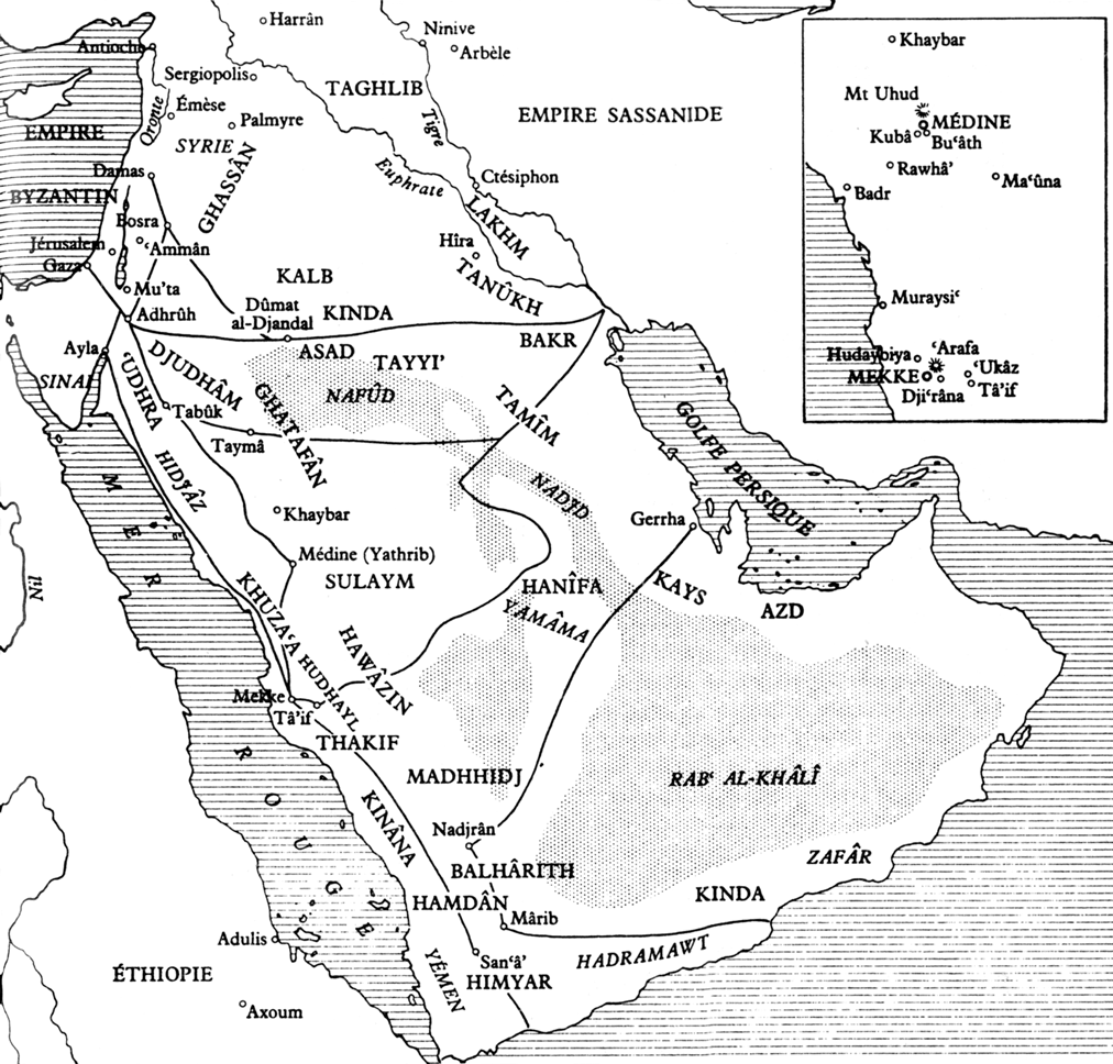 Les tribus nomades de souches diverses, mais tendant presque toutes à étendre vers le nord la zone de leurs migrations, y voisinaient avec de rares noyaux de sédentaires occupant soit les oasis du Hidjâz, le long de la route caravanière de l’encens et des épices, soit l’ancienne Arabie Heureuse, alors en pleine décadence.