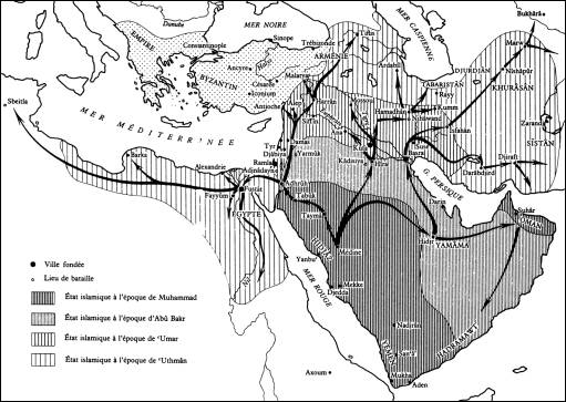 Après la pacification de l’Arabie, qui fut l’œuvre d’Abû Bakr, les troupes arabo-musulmanes suivirent les voies naturelle de pénétration qui les menèrent, soit dans les riches provinces de l’Empire byzantin, vers Antioche et Alexandrie et jusqu’en Arménie, soit vers la Mésopotamie sassanide d’où elles allaient envahir l’Iran par les deux routes de la Susiane et de la Médie.