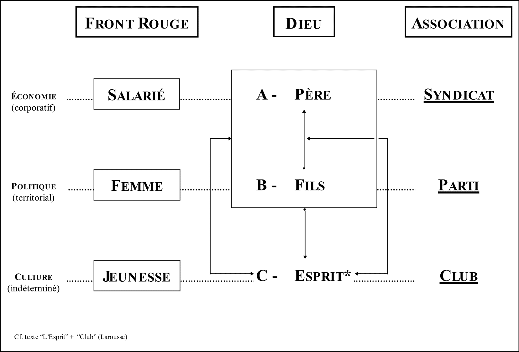1- À partir de la Masse humaine, placée sous le joug de la Caste barbare, naissent ensemble, et le Front Rouge et l’Église Réaliste.